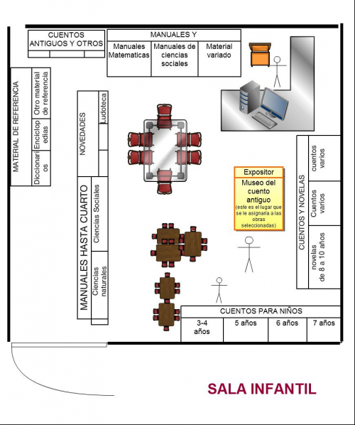 El entorno que posee la sala está ambientado especialemente para niños, con mesas y sillas dedicadas exclusivas para ellos, rompecabezas de goma eva, peluches, y elementos varios para su entretenimiento.Realizamos una actividad llamada "La hora del Cuento" una vez por semana consiste en la lectura de cuentos por parte de narradores de la tercera edad.